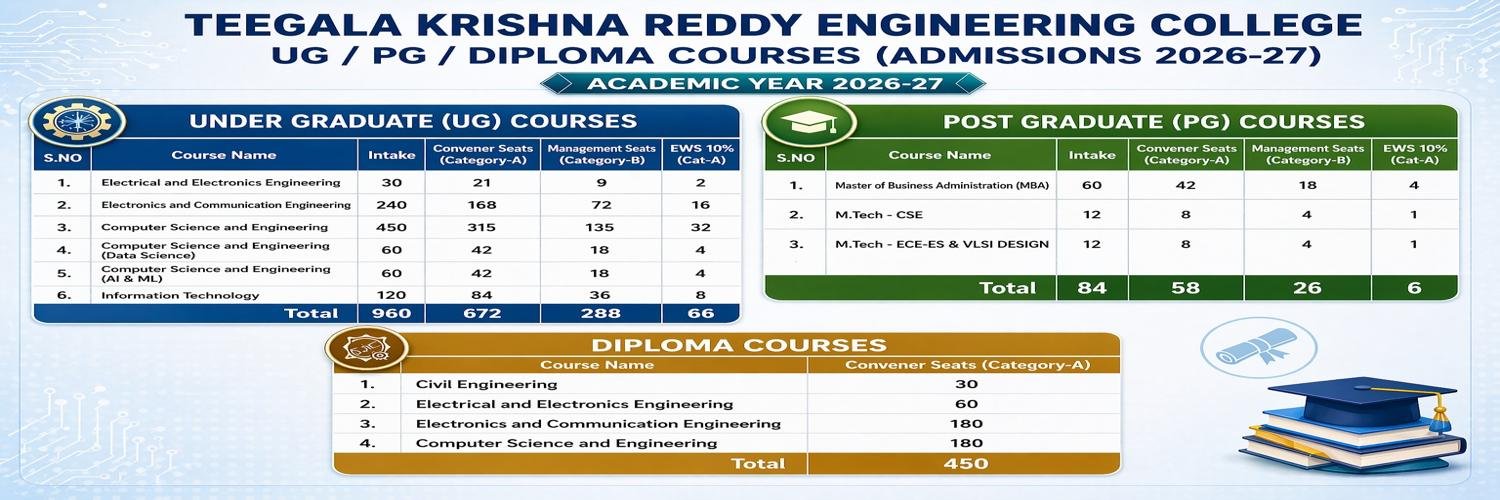 Teegala Krishna Reddy Engineering College is committed to provide quality Technical education to the students through dedicated and talented faculty, good Infrastructure, Laboratories and research.